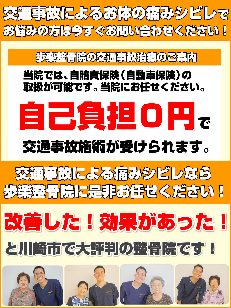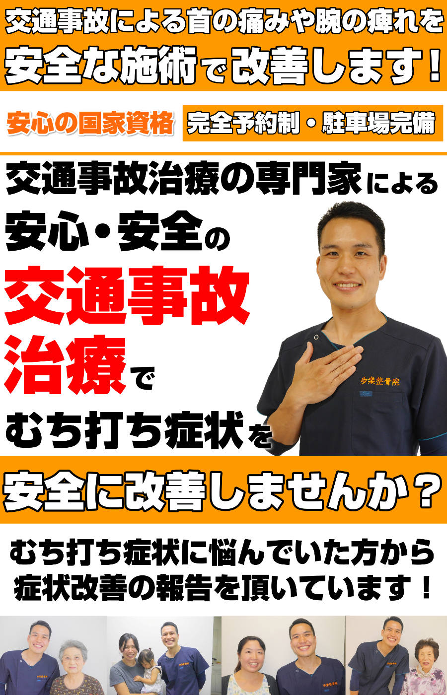交通事故治療は信頼できる歩楽整骨院へお任せください!